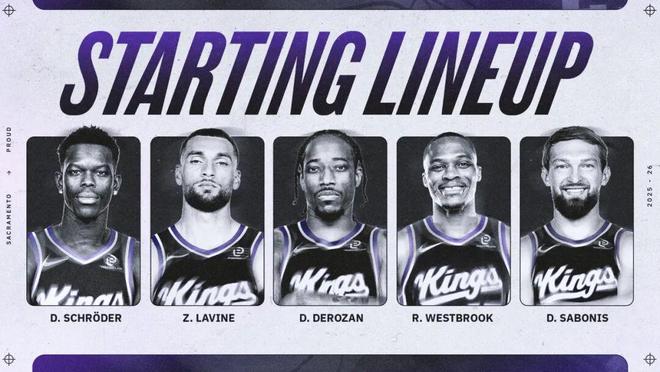 于是你会看到,这场国王派出的首发是:施罗德+拉文+德罗赞+威少+小萨博尼斯——1个内线和4个后卫,其中还有多个防守弱环,威少在这套阵容里顶替的是基根穆雷。